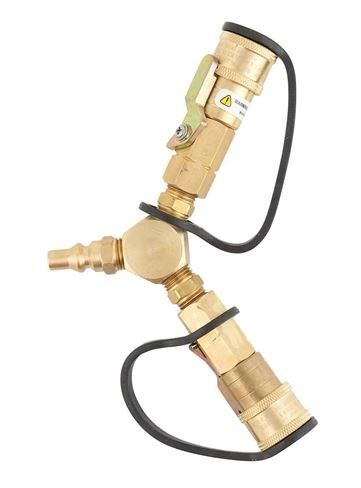 Marshall Excelsior ME23YP Y-Splitter Propane Adapter With Shut Off he Marshall Excelsior Y-Splitter Propane Adapter With Shut Off allows you to connect 2 appliances to your RV quick disconnect supply with a shut off valve. Expand your RV propane quick port to 2 quick connect propane outlets. 1/4″ quick disconnect male x 1/4″ quick disconnect female with shut off x quick disconnect female with shut off Material: Brass Includes: (3) 1/4″ propane protective plug caps 5 year manufacturer warranty